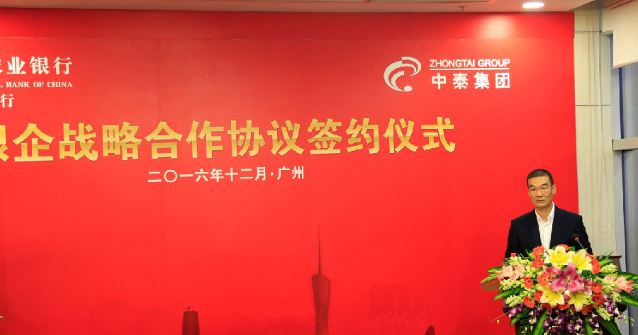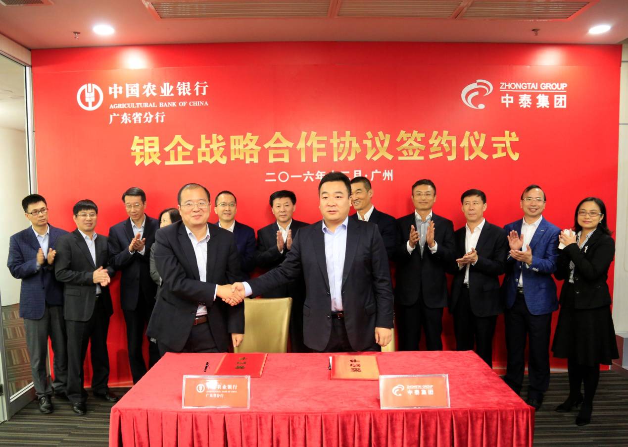 On 13th of December 2016, Zhongtai group and Agricultural Bank of China Guangdong branch have held a grand signing ceremony for “Bank Enterprise Strategic Cooperation Agreement” at Zhongtai headquarters meeting room. Agricultural Bank of China Guangdong sub-branch chief manager Yuan Ming Nan, deputy chief manager Pan Zhi Yong together with total of 13 leaders and Zhongtai group chairman Chen Yan, CEO Gao Peng Fei, Vice President Lee Xu Sheng, Vice President Lee Yong, Vice President Qin Nai Song and company leaders attended the signing ceremony.