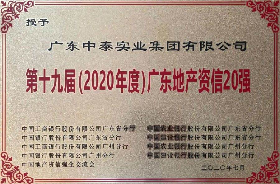 7月10日,以“危机中的新机 变局中的新局”为主题的“资•信”地产金融峰会在广东珠岛宾馆隆重召开,工、农、中、建四大国有银行广东省分行,广州分行等机构联合公布“第十九届(2020年度)广东地产资信20强”名单。中泰集团凭借其稳健的财务管理、综合运营实力、良好的发展态势及市场口碑等,再度荣膺“广东地产资信20强”榜单。