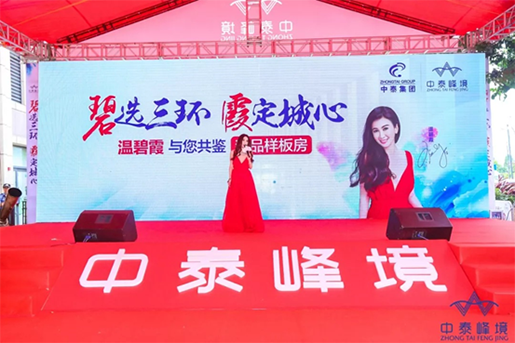 主持人通过一段明星VCR将现场活动推向高潮,女神温碧霞缓缓从星光大道走向舞台,一首《月亮代表我的心》温暖了现场所有人的心,粉丝们更是为之摇旗呐喊。温碧霞与现场嘉宾亲切互动,与台下观众合影,留下了美好的一刻。温碧霞向东莞中泰峰境送出特意为此次活动定制的签名手模,预祝项目开盘大卖,红红火火越来越好。最后温碧霞女士和中泰集团到场领导共同开启新品样板房开放盛典。
